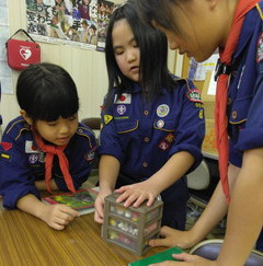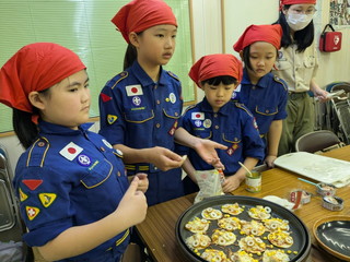 よーく狙って なかなか狙い通りにはいかないよね 得点の計算をします チャレンジ章の発表です くまスカウトへ色紙の贈呈 最後のソングは大きな声で 国旗を降ろす姿も様になっています いつも元気! 旗のたたみ方を教えてあげてね